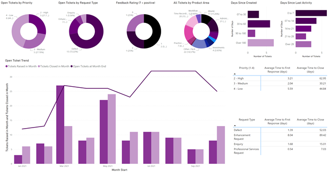 You can view details of service desk tickets that have been raised by your company through the Customer Service Dashboard tile. You will be initially presented with a dashboard view that shows as number of visual widgets and data grids that give you a 360° view of all the tickets that your company has raised with the Service Desk. The dashboard is fully interactive, so feel free to explore!