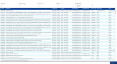 The ticket listings screen shows all the key information related to the tickets raised by your company and includes a number of ease-of-use features, such as sorting, filtering and export to Excel. You can access the ticket listing screen from the dashboard screen, either by clicking on the “Open Tickets” or “View All” buttons on the header bar, or by right-clicking on any data element on any of the dashboard widgets and selecting the “Drill through” option. In all cases except “View All”, the Customer Hub will show you a pre-filtered view of tickets that matches the criteria of your drill-through.