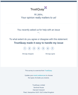 On closure of your ticket, you will receive a feedback survey from us, consisting of a single score and a single question. TrustQuay are constantly trying to improve our customer service and we appreciate all and any feedback that you’re able to provide.